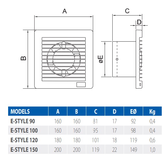 E-STYLE 150 PRO T - оснащена зворотнім клапаном, та таймером затримки вимкнення вентилятора від 5 до 25 хвилин що регулюється. Дана модель вимагає підведення живлення на 3 жили електрокабелю - фаза перемінна (вимикач), нуль, фаза постійна.
