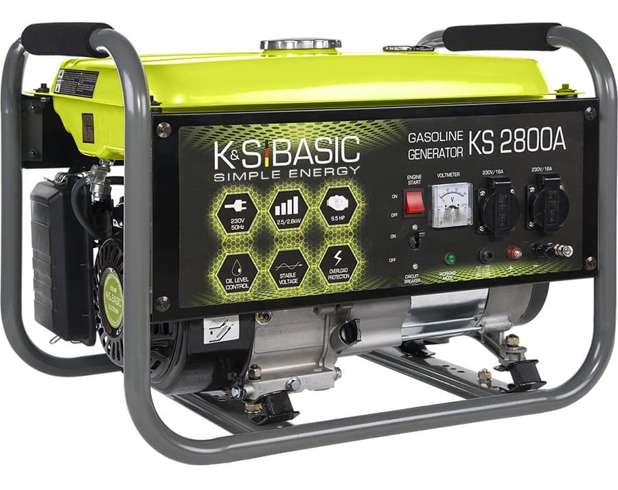 Бензиновий генератор KSB 2800A; Напруга - 230 B; Спеціальні функції – Бензин; Максимальна потужність - 2.8 кВт; Номінальна потужність - 2.5 кВт; Тип запуску – Ручний; Розетки - 2 x Schuko 230V
