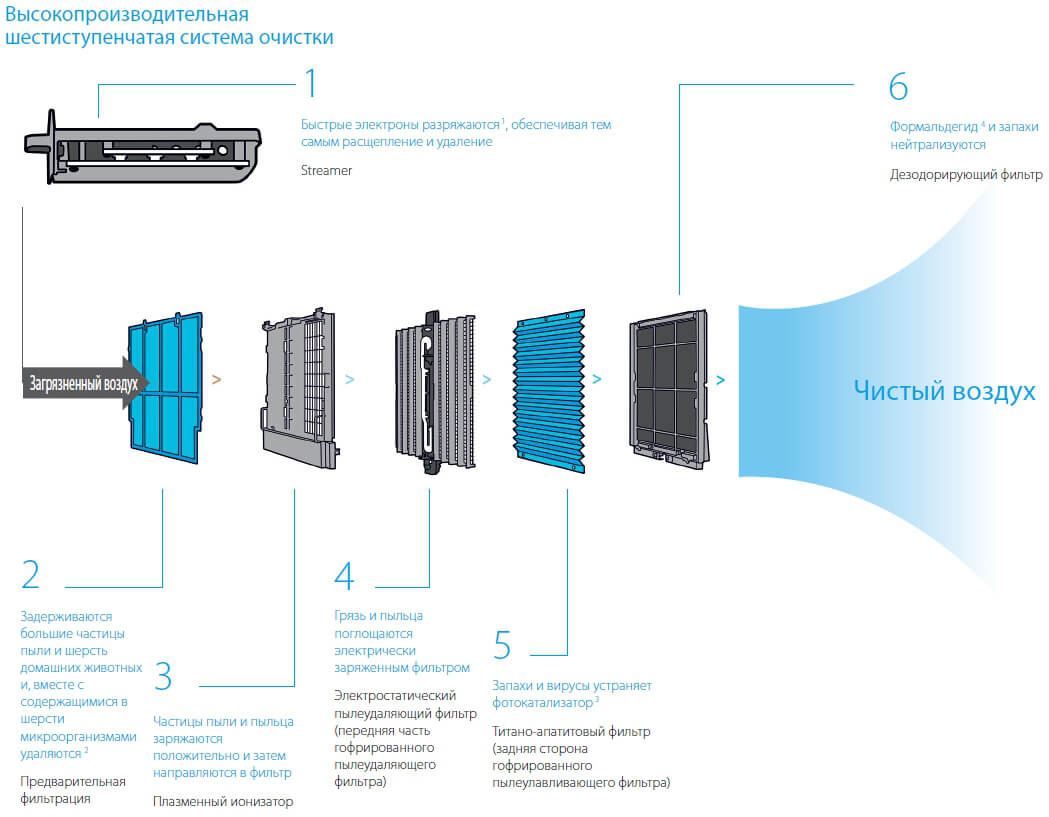 ✓Streamer - Генератор быстрых электронов для удаления вирусов и алергенов<br>✓Фильтр предварительной очистки - задерживает большие частицы - шерсть, пыль, бактерии, алергены<br>✓Плазменный ионизатор - электрически заряжает пыль и пыльцу<br>✓Электростатический фильтр - сборник электрически заряженной пыли и пыльцы<br>✓Титаново апатитовый фильтр - удаляет неприятные запахи и вирусы<br>✓Дезодорирующий катализаторный фильтр - удаляет формальдегиды и запахи