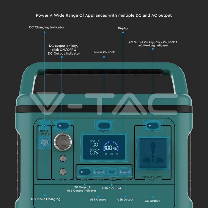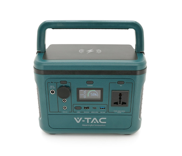 Портативна зарядна станція V-TAC VT-606, 500W, 568Wh — компактне джерело живлення для дому, подорожей і активного відпочинку. Ємність 568Wh, потужність 500Вт (пікова — 1000Вт), підтримка AC, DC, USB, Type-C PD65W і сонячної зарядки. Оснащена LiFePO4 батареєю, інтелектуальним BMS, LED-ліхтарем із SOS і великим LCD-дисплеєм. Легка (5,4 кг) та зручна для використання будь-де.