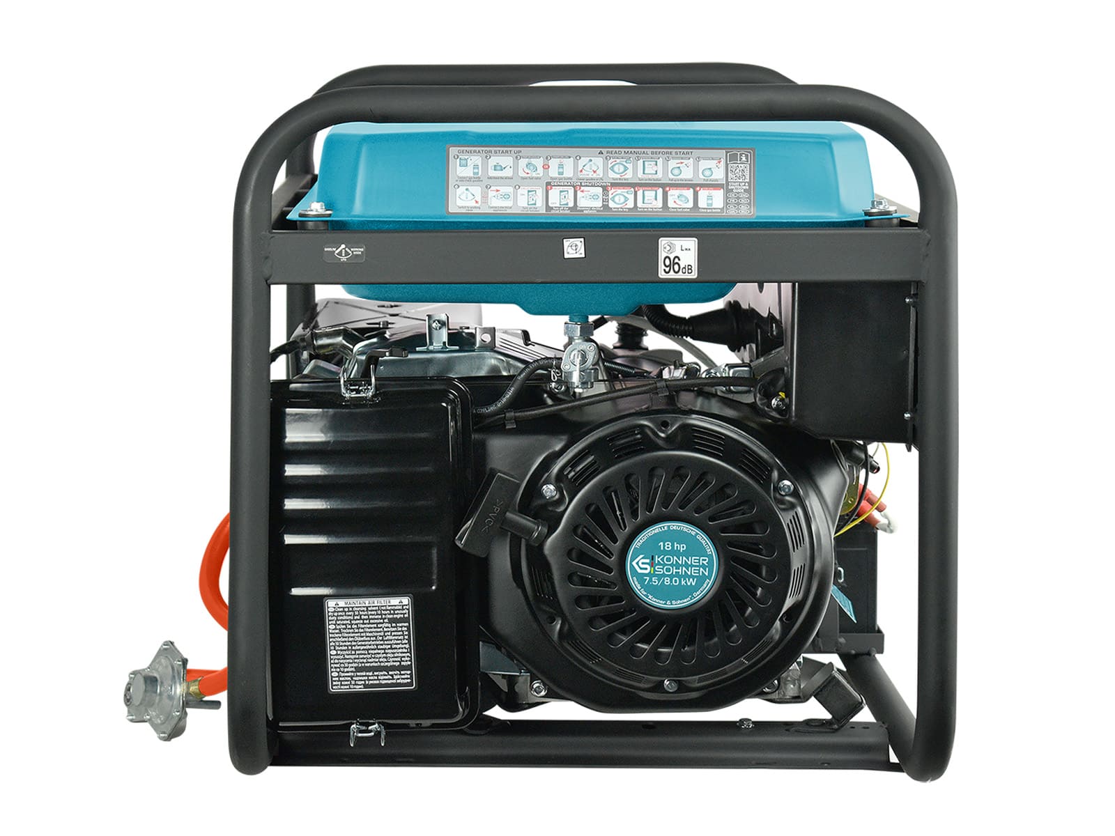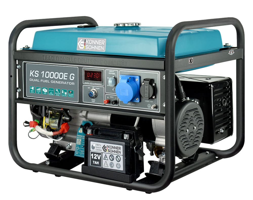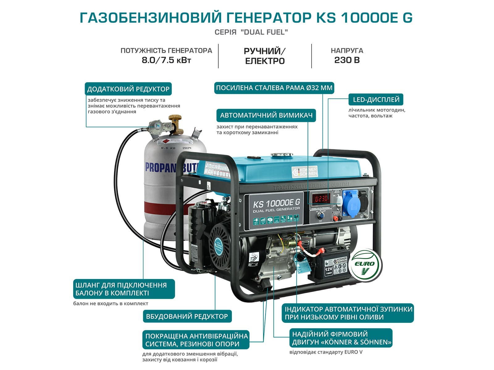 Газобензиновый генератор KS 10000E G. Напряжение - 230 В. Максимальная мощность - 8.0 кВт. Номинальная мощность - 7.5 кВт. Тип запуска - Ручной/электро. Розетки - 1×16А/1×32А. Газ/бензин. Газобензиновые генераторы ТМ "Könner & Söhnen" серии DUAL FUEL на сегодняшний день самые популярные среди покупателей из-за своей экономичности и экологичности. Вы можете использовать генератор как на бензине, так и на сжиженном газе (пропан-бутан). Эксплуатация генератора на газе повышает ресурс двигателя. Все необходимое для подключения баллона идет в комплекте: генератор оснащен регулятором нулевого давления, шлангом с понижающим редуктором; нужно только подключить генератор к вашему газовому баллону. Генератор не предназначен для подключения к газовой магистрали. При необходимости газобензиновые модели легко переключить на работу на бензине. Мощный одноцилиндровый 4-тактный двигатель K&S с воздушным охлаждением обеспечивает стабильную и надежную работу генератора.