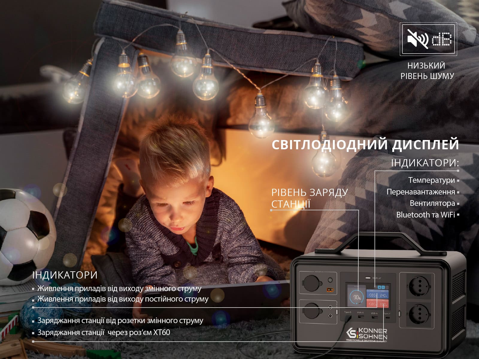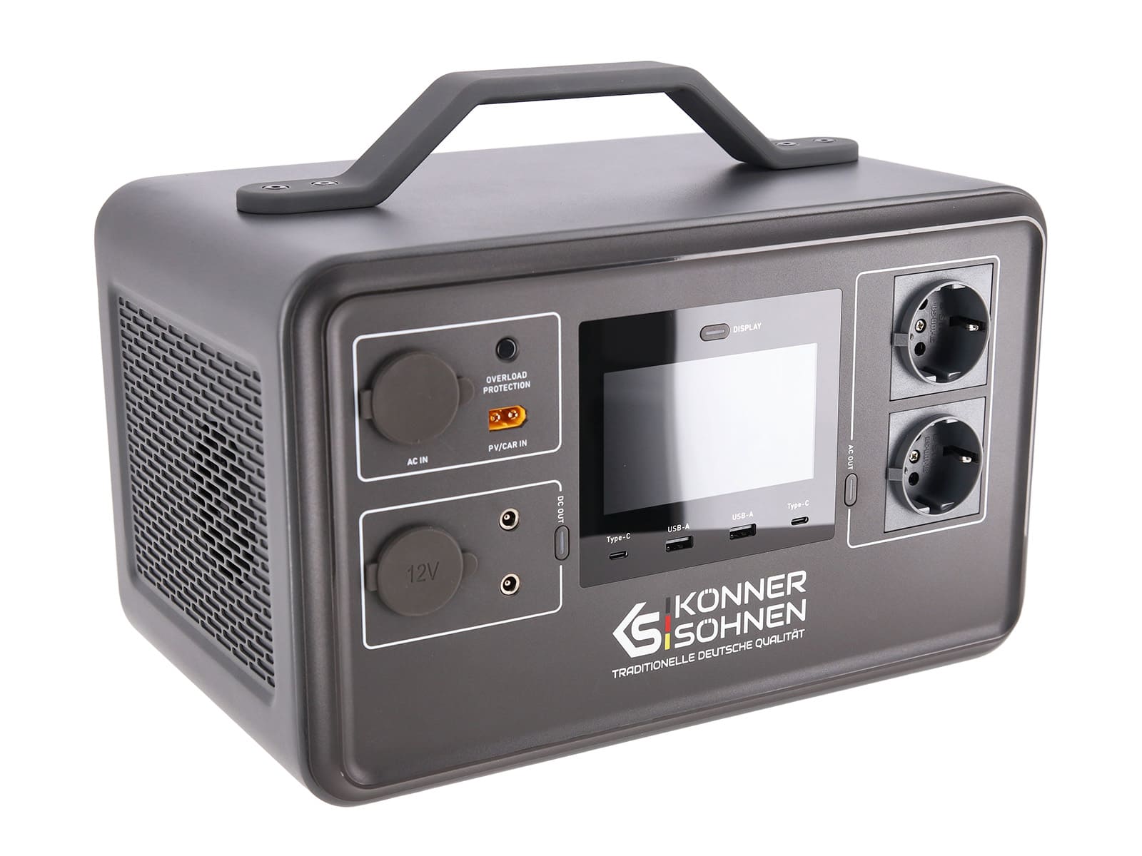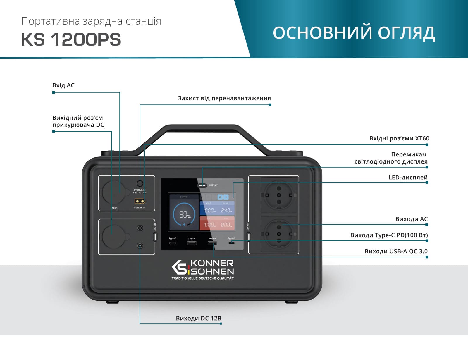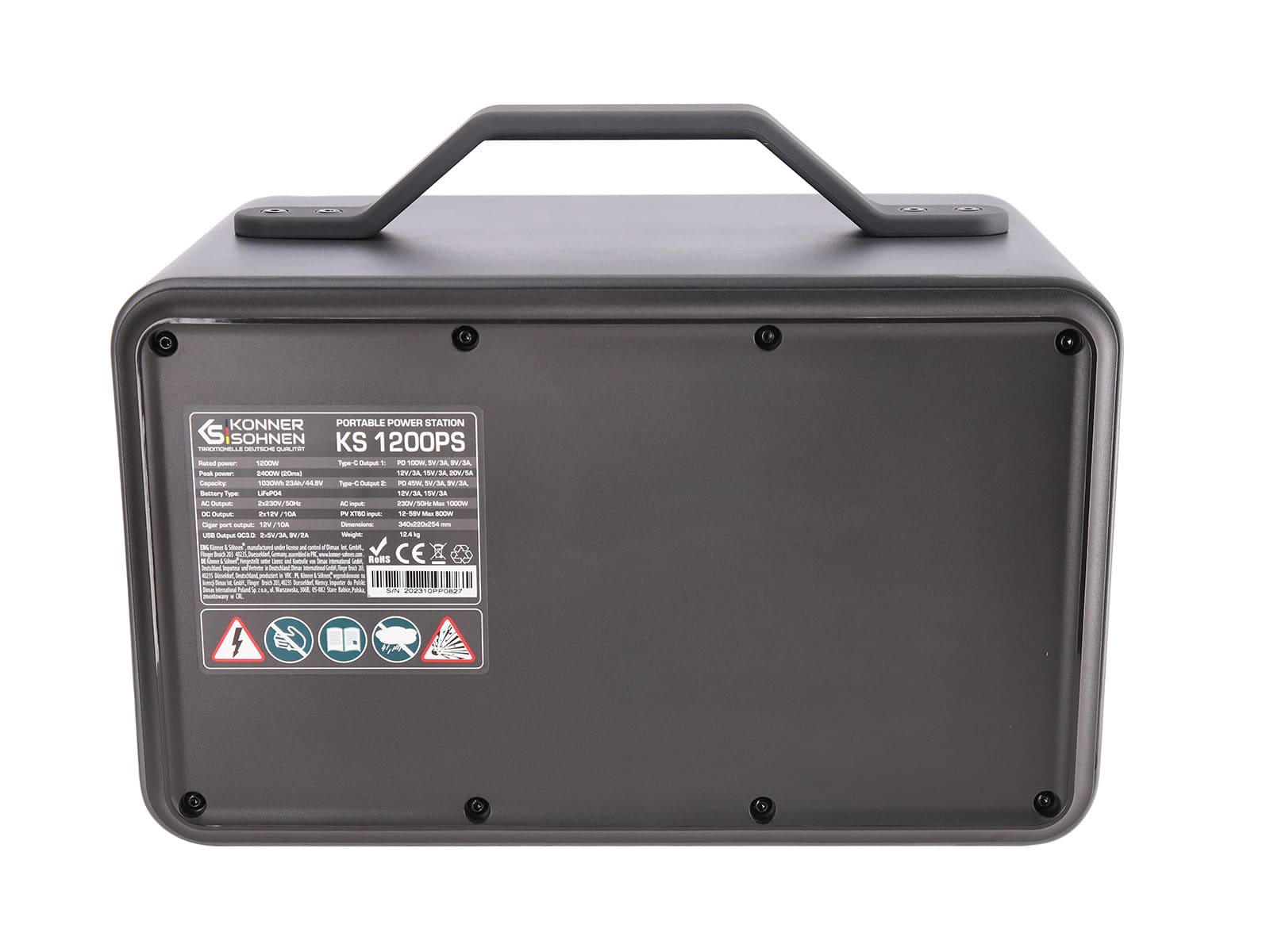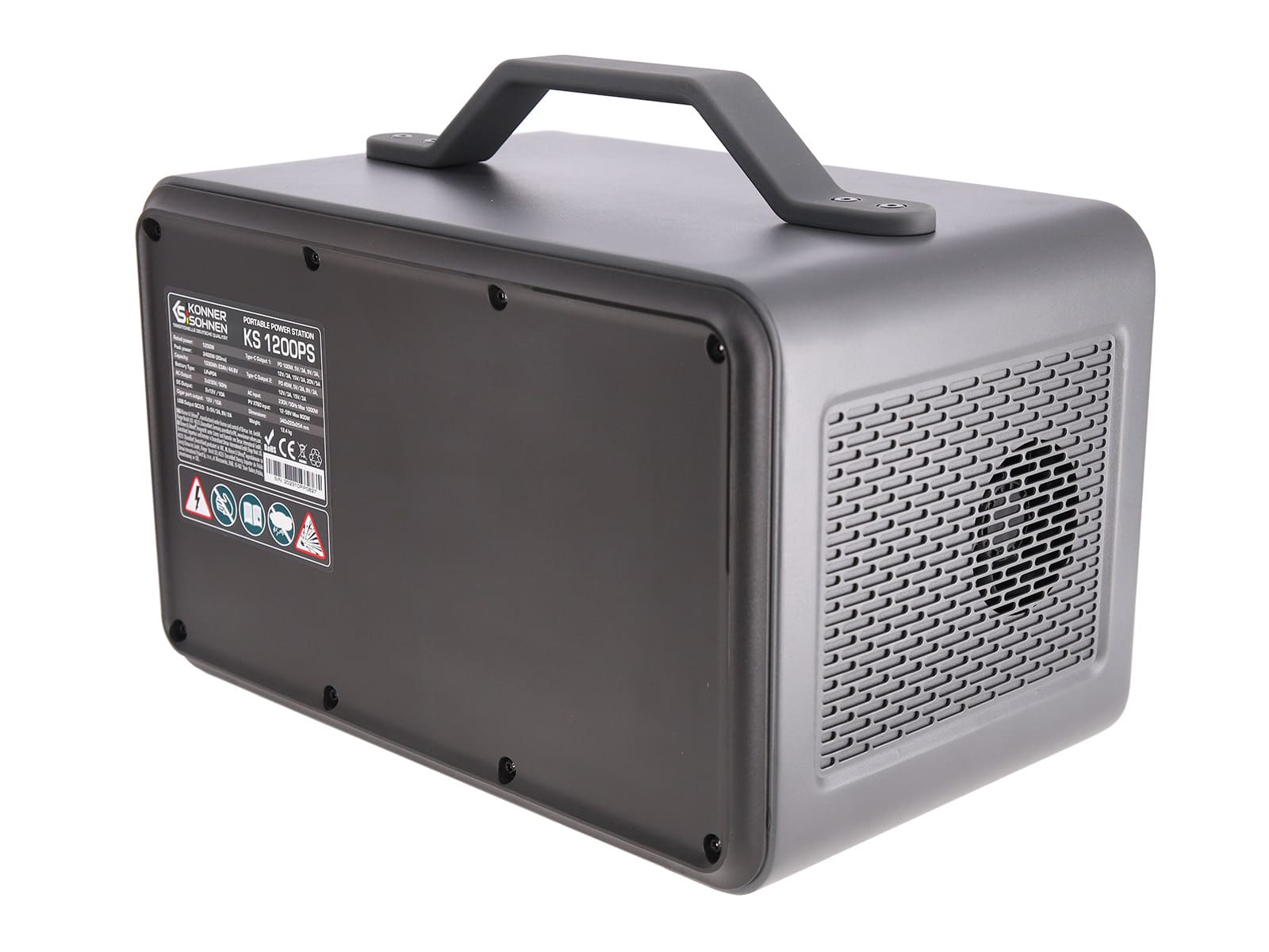 Мобільна портативна електростанція KS 1200PS німецької торгової марки Könner & Söhnen виготовляється з використанням високоякісних LifePO4 літій-залізо-фосфатних акумуляторів високої ємності, які мають більш високу енергетичну щільність в порівняні з Li-ion, вони можуть зберігати більше енергії в компактному форматі та мають великий життєвий цикл – 4000 циклів заряд-розряд. Вона стане надійним помічником для зарядки пристроїв в дорозі або в разі збоїв електропостачання. Її потужності буде достатньо для роботи такої техніки як смартфон, цифрова камера, планшет, дрон, міні-холодильник, насос для накачування, вентилятор. Вона працює тихо, тому дозволить живити електричні пристрої та насолоджуватись часом без будь-якого заважаючого шуму.