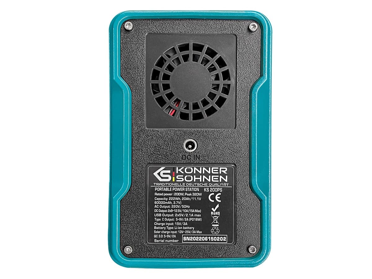 Портативна зарядна станція Könner&Söhnen KS 200PS – це надійне, компактне та ефективне джерело живлення для вашого активного відпочинку або надзвичайних ситуацій. Завдяки номінальній потужності 200 Вт та піковій потужності 320 Вт (3-5 секунд), ця електростанція забезпечує стабільне живлення ваших електронних пристроїв: смартфонів, ноутбуків, освітлювальних приладів та інших гаджетів. Модель оснащена високоякісним літієвим акумулятором ємністю 222 Вт⋅год (60000 мАг, 3.7В), що дозволяє тривалий час підтримувати роботу пристроїв без необхідності додаткової підзарядки.