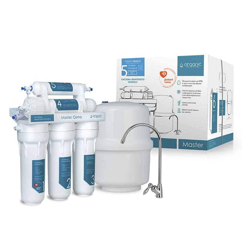 Organic Master Osmo 5 — система обратного осмоса для идеально чистой воды. Система обратного осмоса Organic Master Osmo 5 обеспечивает глубокую очистку воды, удаляя до 99% загрязнений, включая вирусы, бактерии, соли жесткости, тяжелые металлы и хлор. Вода становится безопасной для питья без кипячения и подходит даже для детского питания. Пять ступеней очистки: механический фильтр (5 мкм) – задерживает песок, ржавчину, ил. Угольный карбонблок (5 мкм) – удаляет хлор и органические соединения. Полипропиленовый картридж (1 мкм) – устраняет остаточные механические примеси. Обратноосмотическая мембрана – удаляет 99% загрязнений, включая вирусы и нитраты. Постфильтр – улучшает вкус и запах воды. Компактная система (410×160×390 мм) с производительностью до 200 л/сутки станет идеальным выбором для вашего дома. Organic Master Osmo 5 — чистая и безопасная вода каждый день!