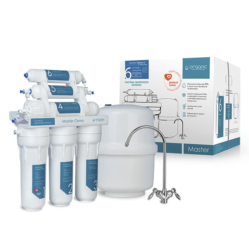 Система зворотного осмосу Organic Master Osmo 6 — це вдосконалене рішення для очищення води, яке поєднує високий рівень фільтрації з корисною мінералізацією. Вона ефективно видаляє до 99% забруднень, зокрема віруси, бактерії, важкі метали, солі жорсткості, хлор і органічні речовини, забезпечуючи безпечну та смачну воду. Після фільтрації вода насичується мінералами, що робить її корисною для здоров'я.
