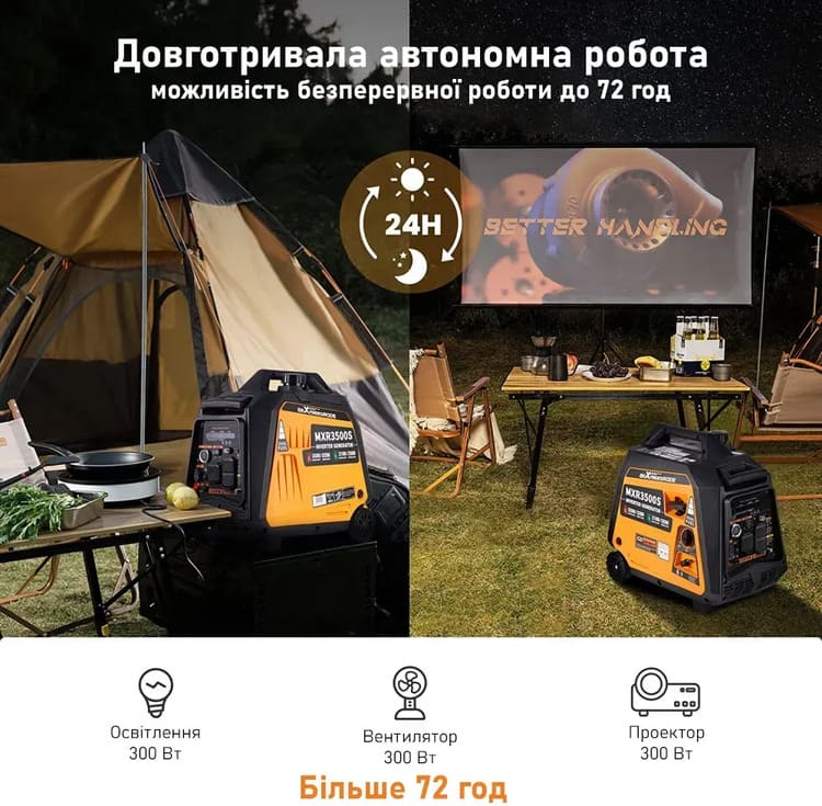 Таким чином, MXR3500s може бути основним або резервним джерелом живлення для будинку, дачі, офісу, кемпінгу або виїзного бізнесу (фудтраки, мобільні майстерні тощо).
