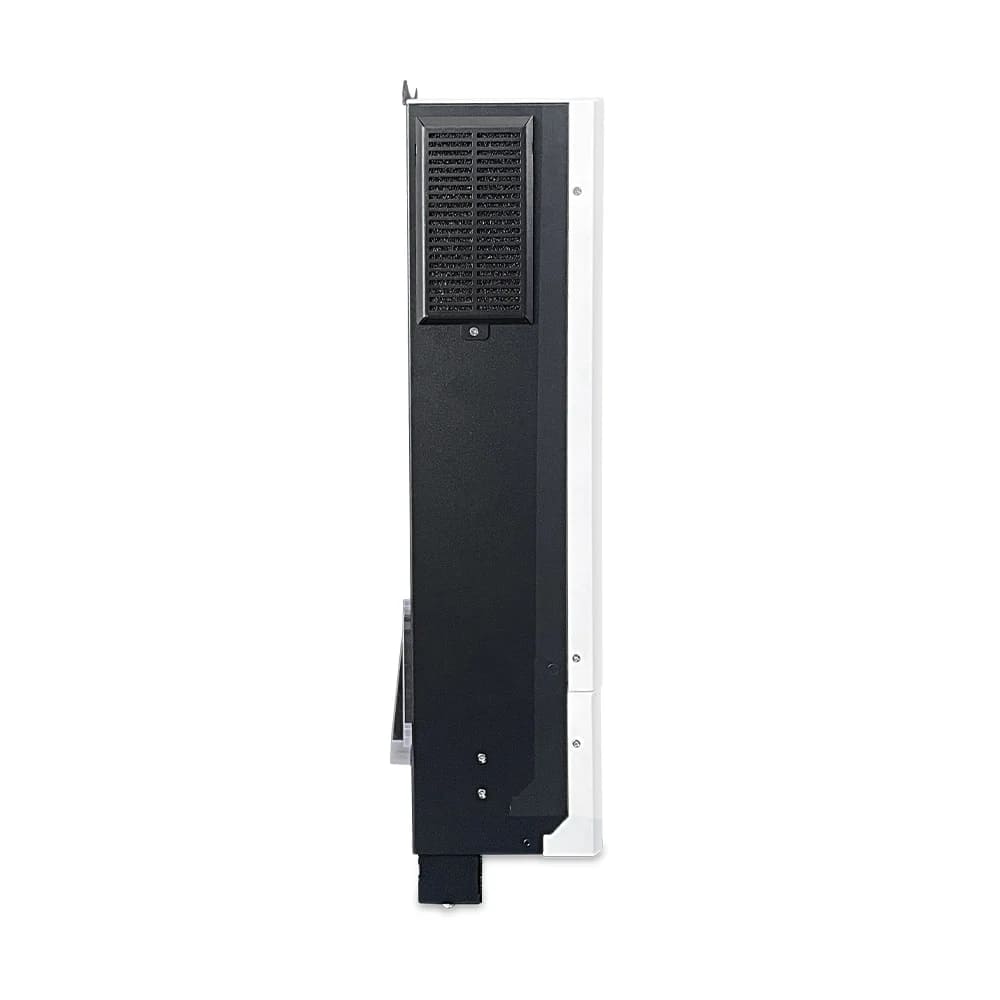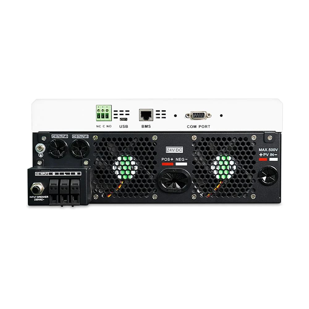 Гибридный однофазный инвертор; максимальная мощность 4.5 кВА/4.2 кВт, кратковременная пиковая мощность 8.4 кВА; чистая синусоида на выходе 220 В; встроенный MPPT-контроллер и сетевое зарядное устройство; максимальный ток заряда 120 А; входное напряжение 90-280 В; диапазон напряжения от солнечных панелей 60-450 В, макс. мощность 5000 Вт; КПД 93%; выходное напряжение 230 В ±5%; выходная частота 50/60 Гц; напряжение аккумуляторной системы 24 В; время переключения на АКБ 10 мс; поддержка зарядки аккумуляторов типа AGM/GEL/LiFePo4/Li-ion; встроенный локальный WiFi – только для мониторинга через мобильное приложение; LCD-дисплей; функция холодного пуска; режим смешивания; защита от перегрузки, короткого замыкания и перегрева; рабочая температура 0°C~+50°C; размеры 583 / 380 / 214 мм, вес 9.6 кг.