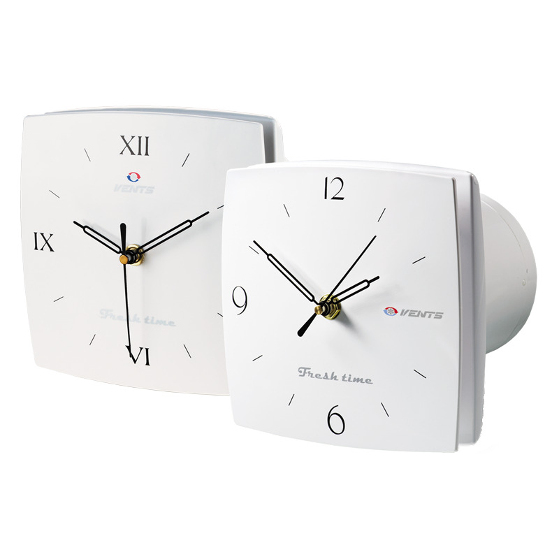 Осьовий витяжний вентилятор з декоративною панеллю – годинником. У корпус вмонтований кварцовий годинник на батарейках. На лицьову панель нанесено арабський або римський циферблат. Сучасний дизайн та естетичний зовнішній вигляд. Корпус і крильчатка виконані з високоякісного та міцного АБС-пластику, стійкого до ультрафіолету. Конструкція крильчатки дозволяє підвищити ефективність вентилятора та збільшити термін експлуатації двигуна. Клас захисту – IP34. Р – вентилятор з римським циферблатом.